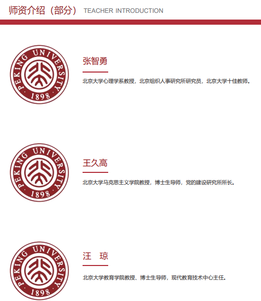 项目邀请到了多位来自北京大学等知名高校的教授参与授课,其中包括心理学系教授张智勇、马克思主义学院教授王久高等业内专家,他们将以丰富的理论知识结合实际案例分析,为学员提供全面而深入的学习体验。